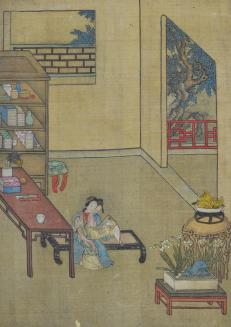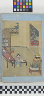 DescriptionAlbum of Chinese romantic, not erotic, scenes. 12 paintings in total. Wooden cover on front and back with exposed spine.Status