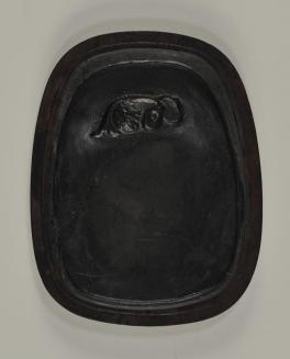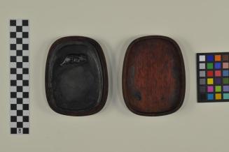 DescriptionOval ink stone with small fish motif located in the well. The stone is nestled in a plain custom wooden box with detached lid.Status