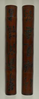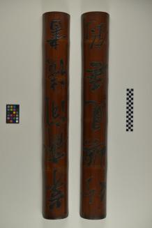 Description1 pair of carved wooden poles, displaying Chinese calligraphy.Status