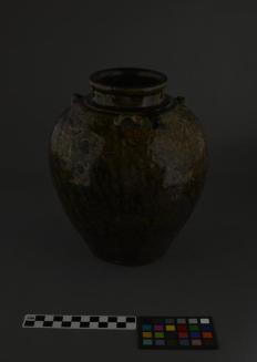 DescriptionGreen/brown glaze; textured surface; four small handles attached to top; short neck.Status