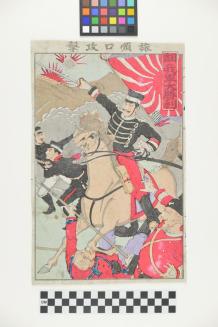 DescriptionMilitary scene. Japanese soldiers charging into battle from the right. One Japanese officer on horseback.Status
