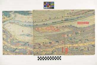 DescriptionTriptych. Aerial view of landscape. Various types of buildings enclosed by wooden pallisade structures, along a river.Status
