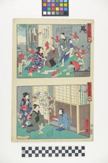 DescriptionIn this print the artist depicts the influence of good and evil on the lives of men and women in Japan. Good and evil appear as tiny anthropomorphic figures, with the appropriate kanji character for good or evil on each face. In the top scene, evil spirits are depicted as crude and violent, inciting acts of violence and immorality, such as drinking to excess and neglecting one’s family and duties. In the bottom scene, good spirits are shown encouraging and supporting positive behaviours, such as honouring the family and engaging in charitable work.Status