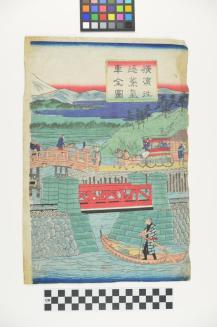 DescriptionR panel of a triptych, depicting body of water with two bridge crossings, one for pedestrians and horse drawn carts, and one for a steam engine. Male figure is standing in a boat at BR. Mount Fuji pictured in the background.