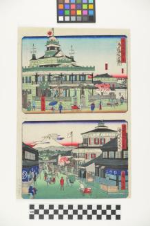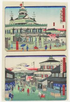 DescriptionUncut woodblock print comprised of two separate and distinct views of Tokyo. The top image depicts the five-story Mitsui-gumi House, completed in 1874, which housed the First National Bank. The Western-style lower floors are topped with a miniature castle reflecting shogunate style, complete with a tiled roof. The imposing structure is surrounded with a walled courtyard topped with an iron fence, with a blossoming cherry tree just inside the entrance. The bottom design shows a busy street scene with pedestrians sharing the road with rickshaws. Both modern and traditional buildings line the road, and Mt. Fuji is visible in the distance, wreathed in clouds. This print is a wonderful showcasing of the rapid modernization of Japan during the period.Status