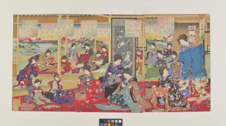 DescriptionScene of women gathered in a palace interior, sewing. At right, a beauty measures out a length of cloth with a wooden ruler, smiling as she looks up at a companion holding an elegant blue kimono. In the center, three women work with needles and thread as they sit next to sewing chests, with two younger girls sewing on their own projects to the left. Above them in another room, a woman irons a kimono flat using a long-handled pan filled with hot coals. The rooms open onto a lovely garden with a lake framed by blossoming cherry trees. Small insets above show pattern layouts with instructions for various garments. A handsome design filled with lively colour and wonderful detail, such as the small child dangling a ball above a playful cat.Status