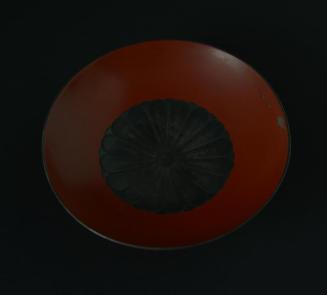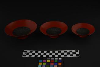 DescriptionSet of three concentric sacking sake cups with Japanese imperial family crest (16 petal chrysanthemum) set upon a red background with gold trim.Status