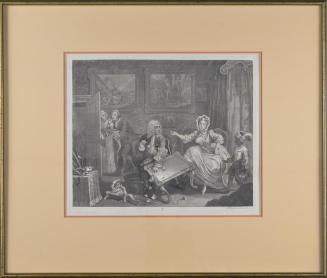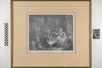 DescriptionThe harlot (Moll Hackabout) is now the mistress of a well-to-do Jewish merchant, and is living a life of luxury. She keeps a west-Indian servant and a monkey, and the room is lavishly decorated with works of art and fine furniture. In this plate the merchant comes home unexpectedly and in an attempt to distract him so her lover can sneak out unseen, the harlot knocks the table over as a distraction.