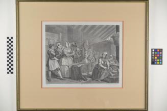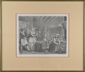 DescriptionThe harlot is now confined to prison (likely Bridewell Prison, a correction house for prostitutes, and petty criminals). The other female inmates mock her. One woman mockingly pulls on the lace of the harlot’s collar, winking at the viewer. What appear to have been beauty marks in past plates, now appear to be signs of syphilis on the harlot's face.