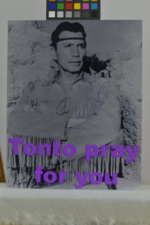 DescriptionGreyscale archival image with "Tonto pray for you" in large pink/purple lettering along the bottom.Status