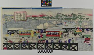 DescriptionTriptych depicting a busy bridge over a river during the Meiji era. Horse-drawn streetcars carry passengers down tracks running accross the scene, while carriages, rickshaws and pedestrians share the road. Warehouses line the waterfront, with rooftops spreading out on either side, and a castle nestled among the trees at the upper right. Mt. Fuji can be seen in the background, rising above the flags blowing in the wind.Status