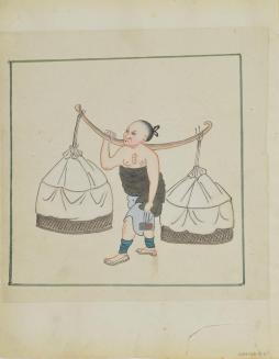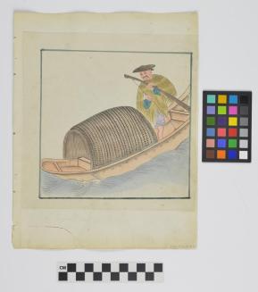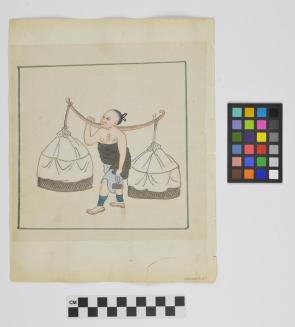 DescriptionSide A depicts a man in a sampan boat sailing down a river. Side B depicts a bare chested man carrying two covered baskets on a shoulder pole.Status