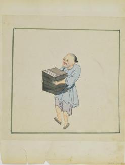 DescriptionSide A depicts a man in a blue shirt, carrying a box. Side B depicts two men carrying a sedan chair with an occupant inside.Status