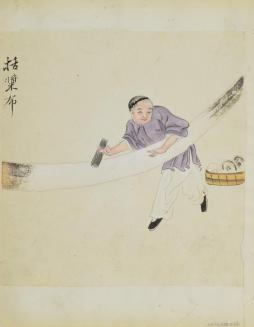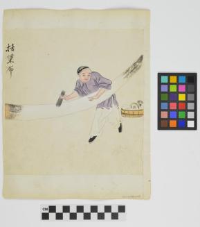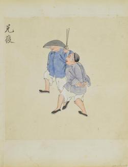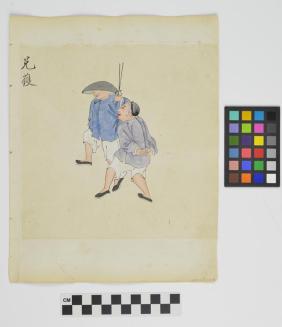 DescriptionSide A depicts two men walking, one carrying rods and one with his hands behind his back. While Side B depicts a man in purple robes painting? a banner?Status