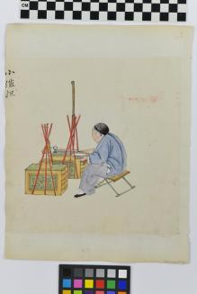 DescriptionSide A depicts a tailor in a purple robe working at a table. Side B depicts a man in a blue/purple robe seated at a table with an instrument of some kind.Status
