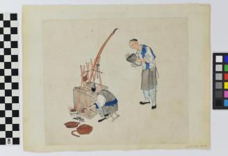 DescriptionSide A depicts a woman seated at a spinning wheel. Side B depicts two men repairing pots, baskets and other damaged items?Status