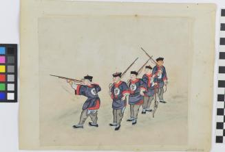 DescriptionSide A depicts two men with caged ducks and chickens. Side B depicts five soldiers holding guns.