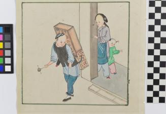 DescriptionSide A depicts a metal worker, seated on a bench. Side B depicts a man carrying a parcel on his back, as a woman and child look on from a nearby doorway.Status