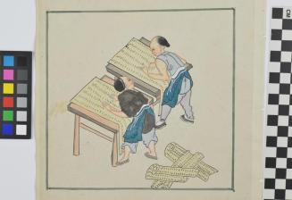 DescriptionSide A depicts two men playing a game?. One figure is seated and the other is standing. Side B depicts two men standing at two separate tables printing.Status