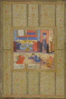 DescriptionPersian miniature scene of six individuals performing tasks. Gold border.Status
