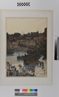 DescriptionView of a fishing fleet docked in a harbor. People are pictured unloading its cargo.Status
