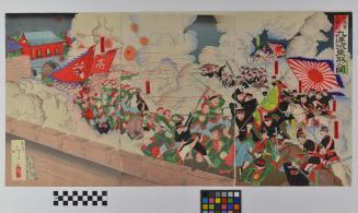 DescriptionTriptych depicting a battle during the Sino-Japanese War. Meiji Imperial troops have cornered the Chinese against a castle wall, fighting hand to hand with swords and spears. Soldiers at the rear fire a volley of shots, sending bullets streaking across the sky and clouds of smoke billowing into the air, obscuring much of the fighting. Several Japanese officers can be seen on horseback, and two large flags fly at right.Status