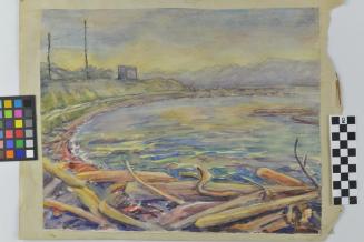 DescriptionLandscape painting depicting shoreline rittled with driftwood.Status