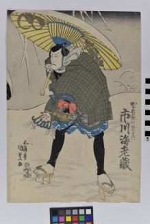 DescriptionKabuki actor Ichikawa Ebizo is in the role of a man with a big umbrella standing in snow. He is holding a New Year's Day ornament.Status