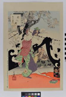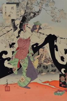 DescriptionA lady in Empo era (1673-80) is dancing with a mock doll at a cherry blossom party.