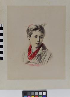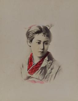 DescriptionThis photograph known as "The Officer's Daughter" is one of the earliest existing portraits of a Japanese Eurasian individual. This beautiful young lady in a kimono wears her hair the western style with a center part and bangs that had become popular in the Meiji era. It seems that the colourist's could chose the type and colour of the floral ornaments worn in the hair.
