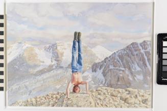 DescriptionMan doing a headstand with a mountainous landscape in the background.