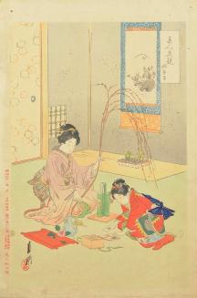 DescriptionTwo women liesurely engaging in flower arranging and reading togetherStatus