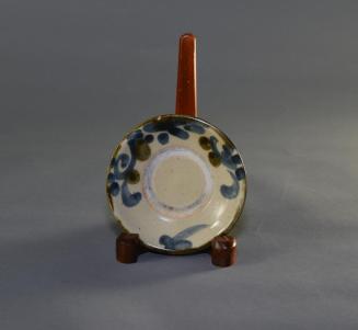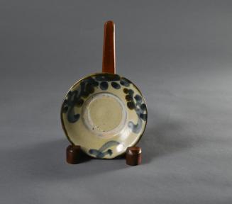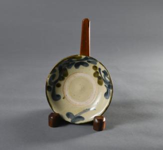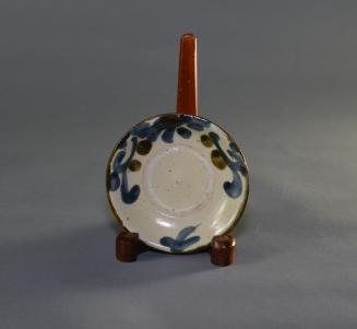 DescriptionSet of 5 small plates, brown and blue decoration on a grey slip, botom glazed with iron brown.Status