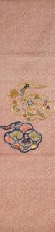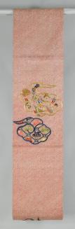 DescriptionRed obi with alternating medallions of embroidered flowers and Buddhist symbols on ground of red and white geometric design based on a flax leaf pattern.Status
