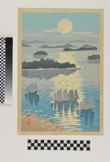 DescriptionSeascape in tones of blue with islands and a large sun in the distance and four sailboats in the foreground.Colour: blue; beige;