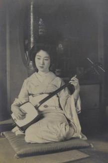 DescriptionPhoto of Geisha sitting on a pillow on the ground, playing a koto.Status