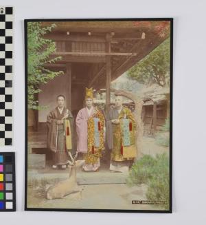 DescriptionIn the grounds of a Buddhist Temple we see three Buddhist priests. They all wear kimono. Two of the kimono have opulent robes called "kesa". The image was taken in the fall, and red maple leaves can be seen in the upper right corner. The deer in the foreground is a bronze statue.Status