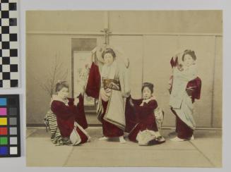 DescriptionIn this image, taken in a studio, the young ladies represent Geisha. They are demonstrating the various steps in Japanese dance. The scroll in the back is from the Stillfried studio. Each young lady is beautifully attired in multiple kimono and tabi socks. Their kimono have the style of sleeves of an unmarried women.