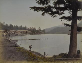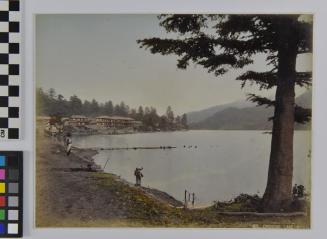 DescriptionChiusenji Lake with Japanese and foreign tourists along the shore. Many guest houses line the shore. A lady with a baby on her back and a man standing viewing the lake from the shoreline.Status