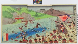 DescriptionBattle scene. Soldiers led by mounted officer’s charge across a river to encounter the enemy of the embankment.Status