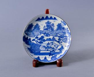 DescriptionCanton blue and white porcelain saucer, decorated with a mountain landscape and village. Six character Daogiang seal mark to the base, and metal mount to rim.Status
