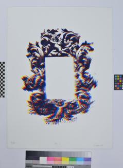 DescriptionThree colour offset moiré pattern print of a ornate frame.Status