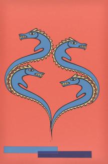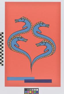 DescriptionFour blue serpant figures on a red background.Status