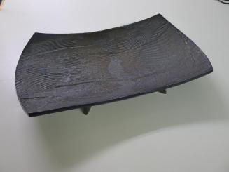 DescriptionBlack Kamloops series porcelain slap tray. Handbuilt with twisted wite impression. High fired reduction.Status