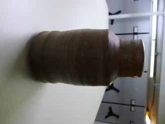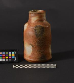 DescriptionWood fired tall stoneware brown vase showing ash deposit on the side.Status