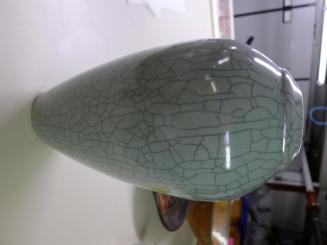 DescriptionTall porcelain celadon crackle glaze vase. Crackle pattern stained with china ink. High fired reduction.Status