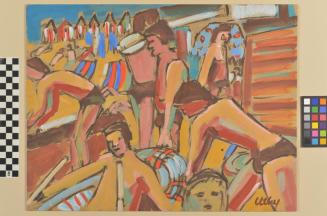 Descriptionpainting of many people in bathing suits with changing huts in the backgroundStatus