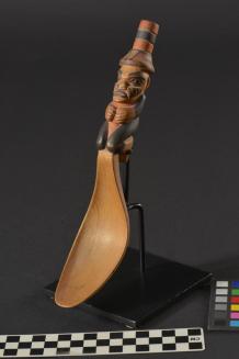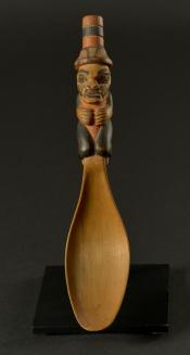 DescriptionTlingit carved wooden spoon with the handle a carved Chief wearing a potlatch hatStatus