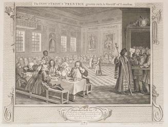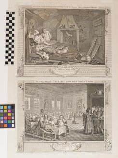DescriptionThe idle prentice in bed with a woman, sifting through valuable items she may have stolen, in a small chaotic and unsanitary room.