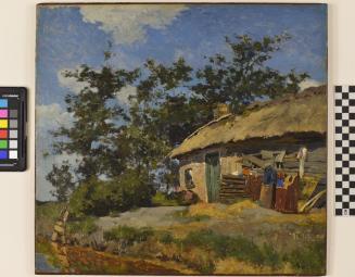 DescriptionAbandoned farmhouse on the edge of a body of a water, cloudy blue sky and a line of trees.Status